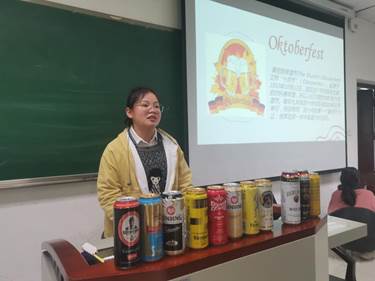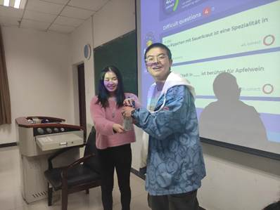 最后一个环节知识竞答,旨在通过抢答10道有关德国饮食文化的题目,检验同学们的学习成果,加深同学们对德国饮食文化的认识。最终答题之星王成帅同学喜悦的领走了奖品——两瓶德国啤酒。