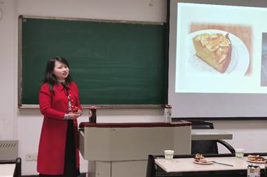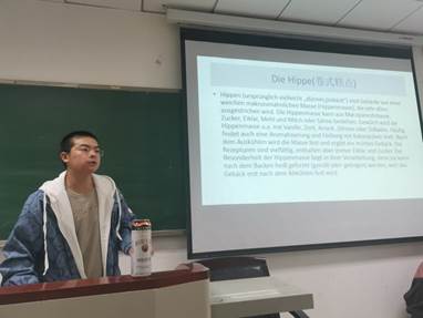台上,同学们生动的讲述着各类美食的历史背景,传说故事,烹饪方法。台下,同学们配合品尝各类食物,咸水面包、果脯蛋糕、华夫饼、风味烤肠等等。这些极具特色的美食刺激着同学们的味蕾,开启了同学们对德国饮食文化的感性认识。还有同学现场表演讲解德国人倒啤酒的方式与礼节,引起了大家激烈的讨论。期间,冯小俐教授还为同学们补充讲解了关于德国Christstollen(果脯蛋糕)的知识,原来吃起来甜甜的Christstollen是德式传统圣诞节必备水果蛋糕,虽然是德国常见的传统蛋糕,但唯有德累斯顿(Dresden)地区生产的最受德国人喜爱。实际上这些课堂之外的文化细节也是德语系学生们的必备技能。