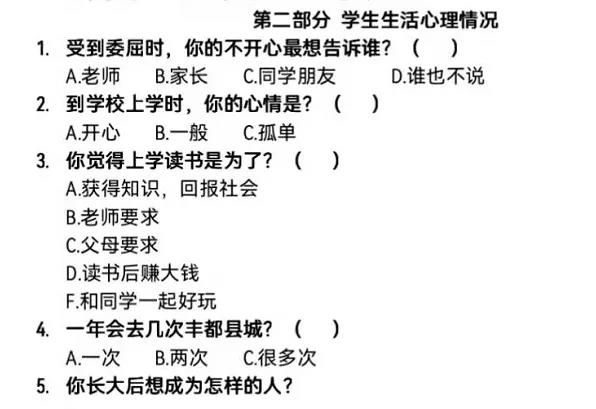 针对学生日常生活与心理健康情况,调研组共设计了以下5个问题: