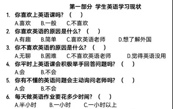 针对学生英语学习现状,调研组共设计了以下6个问题: