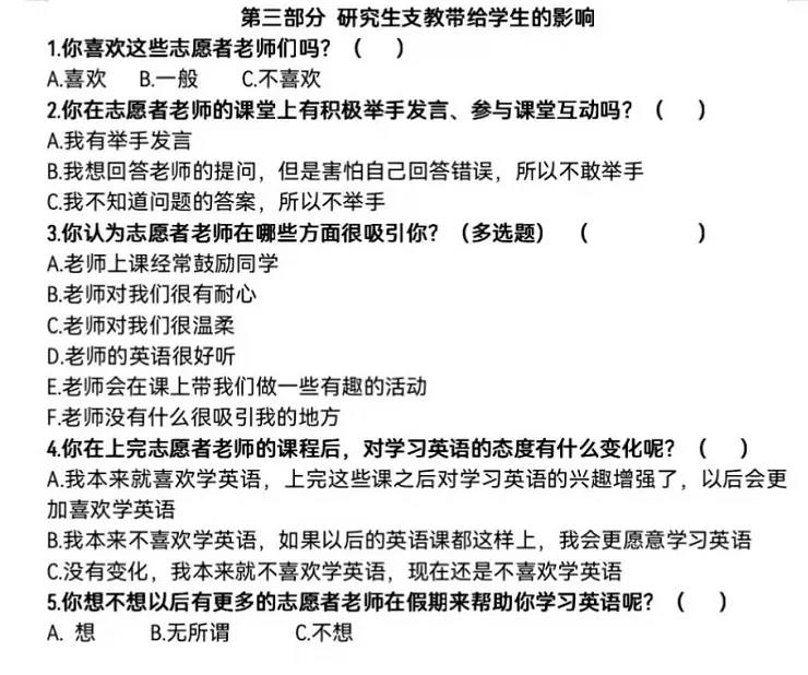 第三部分的5个问题,是对整个研究生支教活动效果的反馈。在问及是否喜欢志愿者老师们时,选择了“喜欢”的学生占100%,直接表明长岭完全小学的学生对此次支教工作的肯定。当问及上完课后对于英语学习态度的变化时,84.51%选择了“我本来就喜欢学英语,上完这些课之后对学习英语的兴趣增强了,以后会更加喜欢学英语”,15.49%选择了“我本来不喜欢学英语,如果以后的英语课都这样上,我会更愿意学习英语”。