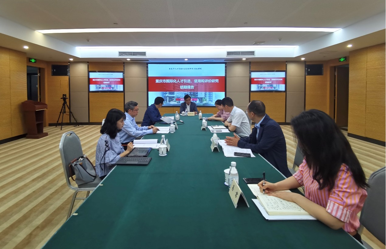 由我院承担的重庆市人力资源和社会保障局委托课题“重庆市国际化人才引进、使用和评价研究”课题结题报告会于2022年4月28日上午在重庆市人力资源和社会保障局1421会议室举行。出席报告会的有重庆市人力社保局党组成员、副局长夏杨松,重庆市委组织部人才处干部段沁,重庆市教委人事处处长齐正军,重庆市人力社保局专业技术人员管理处处长易君,重庆市人力社保局综合处(国际合作处)处长余平。文旭院长,肖开容副院长,吴灵蕊老师代表课题组出席并作结题汇报。