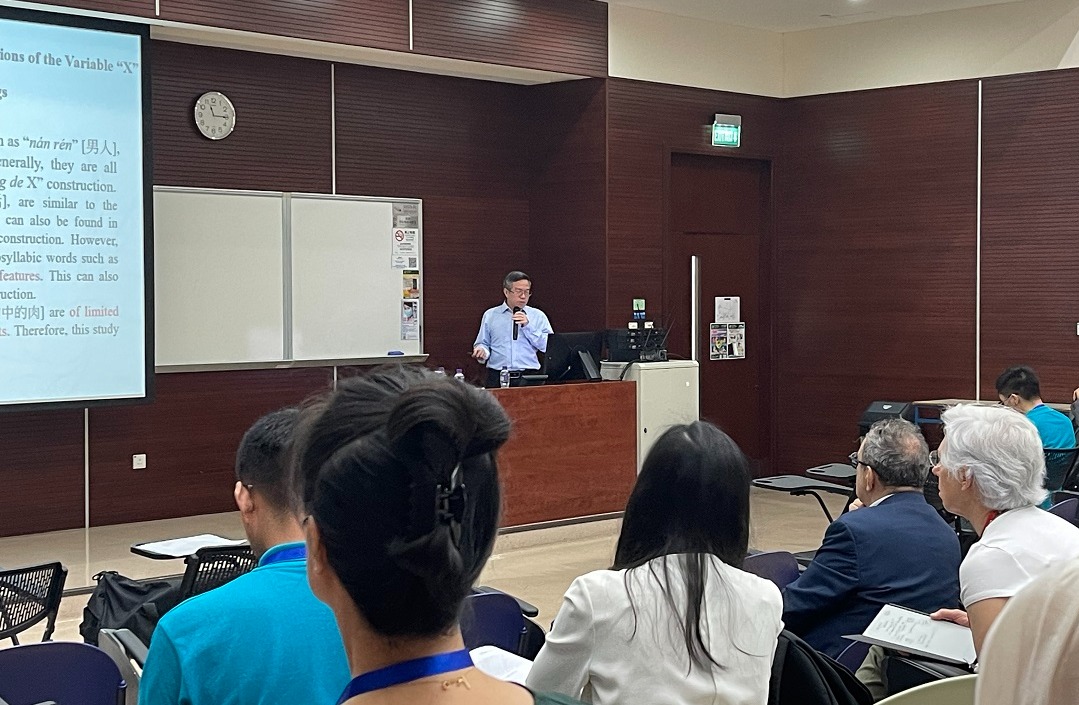 学院文旭教授应澳门科技大学国际学院邀请,在年会上做题为“The Chinese ‘X zhōng de [中的] X’ Construction: A Cognitive Construction Grammar Approach”的发言。发言聚焦汉语构式“X中的X”(如“经典中的经典”),基于已有研究和BCC、CCL语料库,分析了该构式的句法、语义和语用特征,提出具身认知(情景编码假说和数量象似性)和构式压制是其生成机制,承继性(多义链接和实例链接)、类比(语义牵引)等是其生成动因。