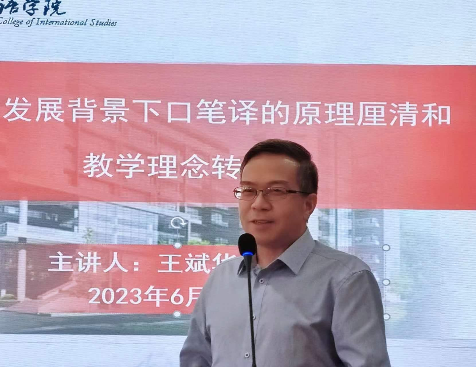 最后,文旭院长对王教授的莅临指导表达了感谢。文院长表示,王教授的讲座十分全面和前沿,兼具学术性和趣味性。文院长提到,AI等技术的进步对于翻译教学和研究来说既是挑战,也是机遇。对于此类技术,我们应当持有相对开放和包容的态度,拥抱科技进步,并让其成为我们教学和科研中的利器。