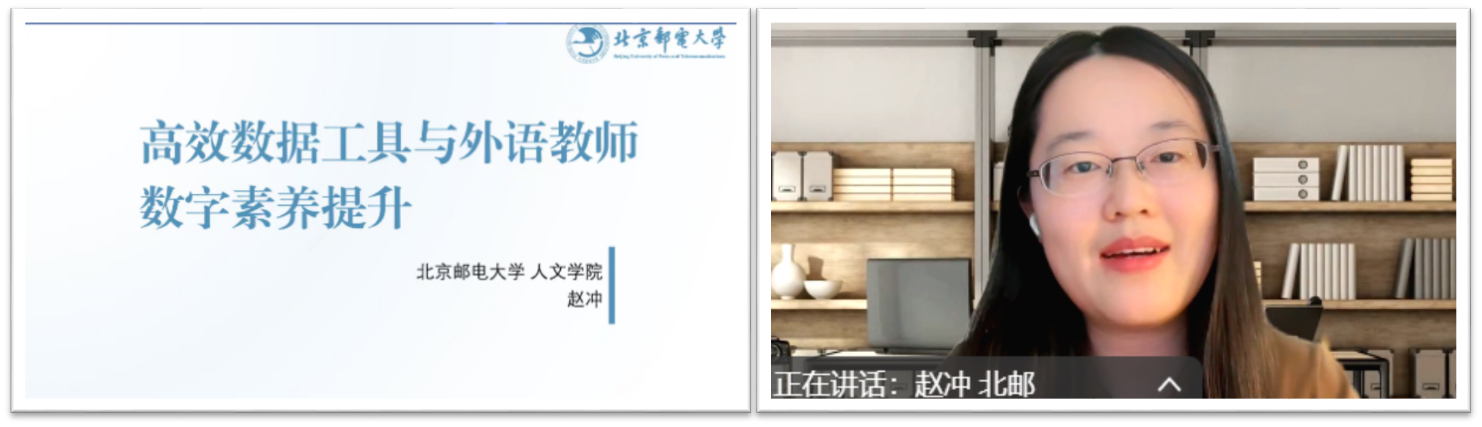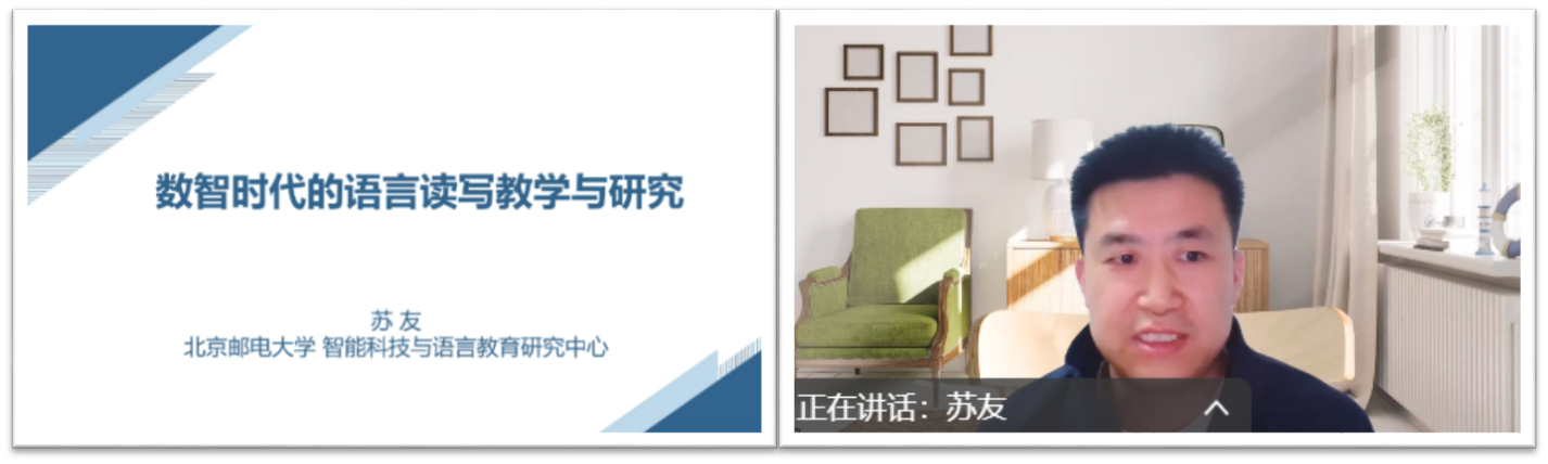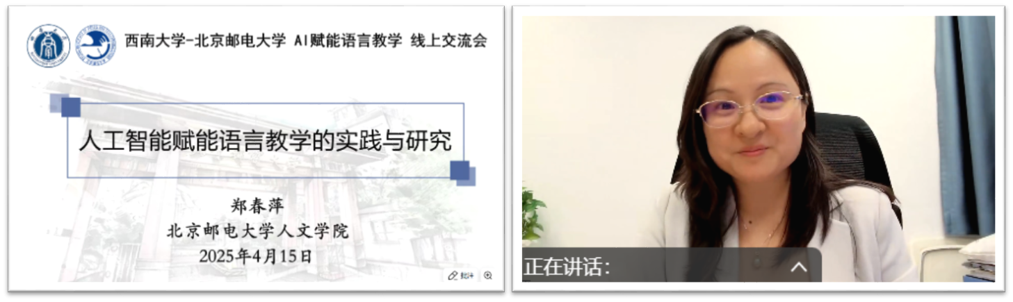 首场讲座由北京邮电大学人文学院副院长郑春萍教授主讲,主题为“AI赋能语言教学与研究”。郑教授结合北邮数字赋能语言教育的创新实践,系统梳理了人工智能在语言教学中的实践案例与学术研究趋势,提出“人机协同”教学模式的优化路径。