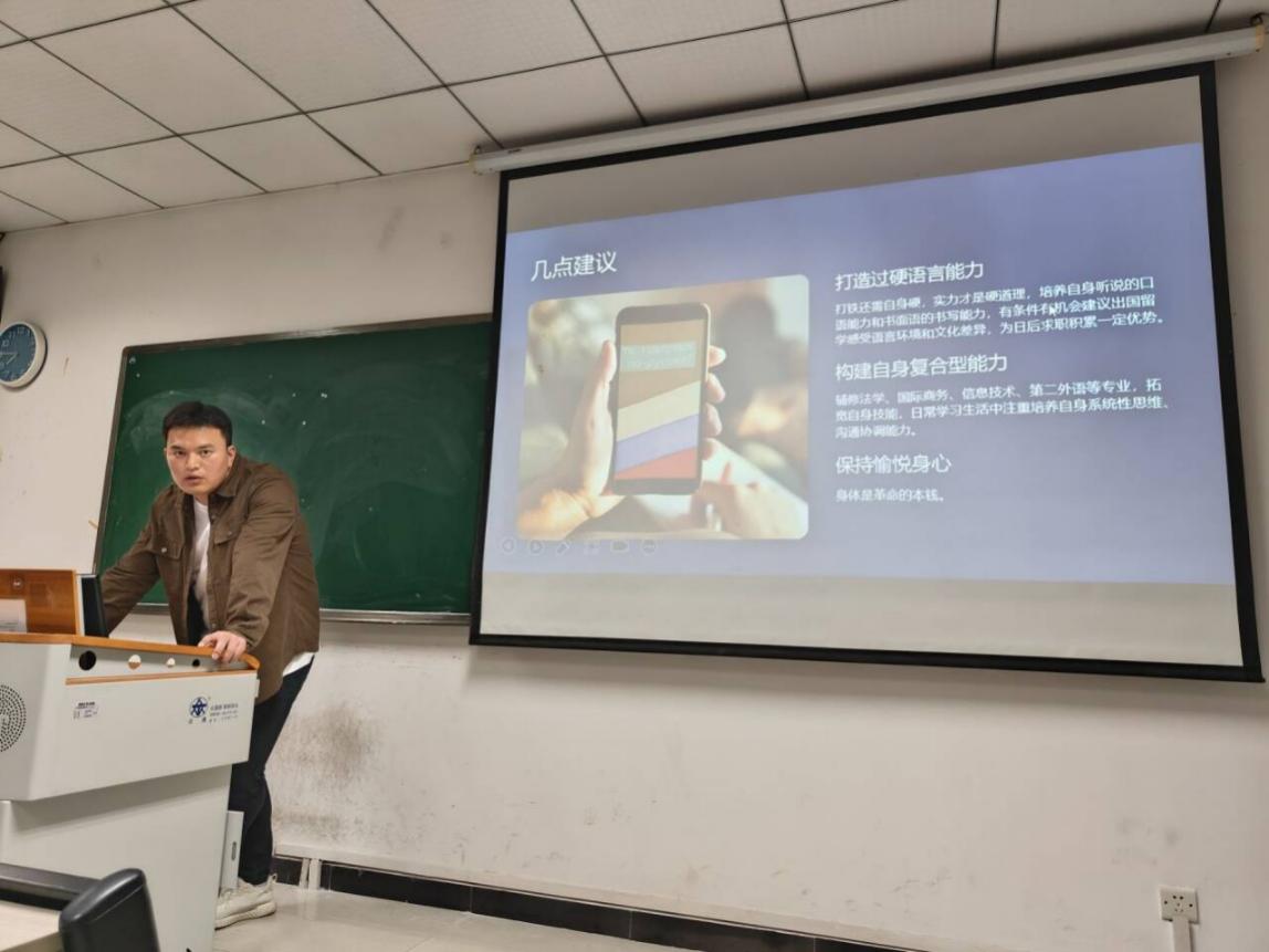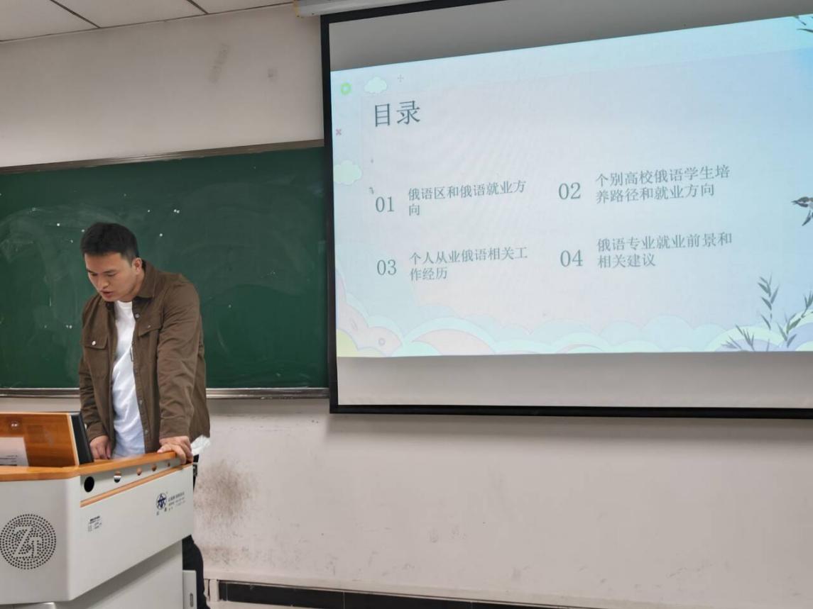 在主题分享环节,安维嘉校友从四个方面进行了深入讲解。他首先介绍了俄语区的分布情况以及俄语专业的就业方向,让同学们对俄语的使用范围和就业领域有了更清晰地认识。