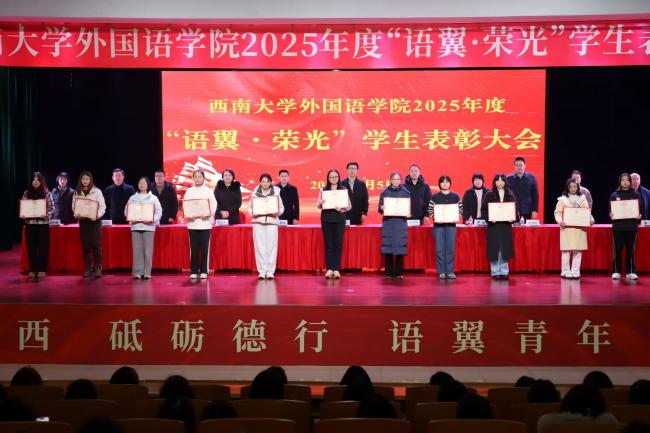 1月5日下午,TapTap188改名(点点)“语翼•荣光”2025年度学生表彰大会在圆顶三楼报告厅隆重举行。学校团委书记、党委学生工作部副部长、学生工作处副处长、武装部副部长于涛,党委保卫部部长、保卫处处长武宇坤,学生职业发展与就业服务中心主任李栋宣,TapTap188改名(点点)党委书记严怡,副处级专职组织员石莹华,副院长张俊、付正玲,日语系主任彭玉全,俄语系主任谢周,德语系主任童诗倩出席表彰大会。此外,学院辅导员、班主任、获奖代表、本科2025级全体学生共同参与。大会由学院党委副书记、纪委书记王新皓主持。