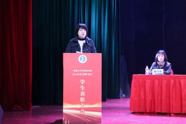 最后,学院党委书记严怡作总结讲话。她向关心关爱学生成长的学校各职能部门表示感谢,对获得表彰的学生表示祝贺,对辛勤付出的学院教职员工表达敬意。同时,严书记对学院全体学生提出了三点期望:永葆“中国心”,做有根有魂的外语人;激发“创新力”,做大胆探索的探路者;锤炼“行动力”,做脚踏实地的实干家。严书记希望学院广大学生在行动中不断磨砺批判性思维、跨文化沟通与全球胜任力,真正成为兼具中国情怀与国际视野的卓越人才。