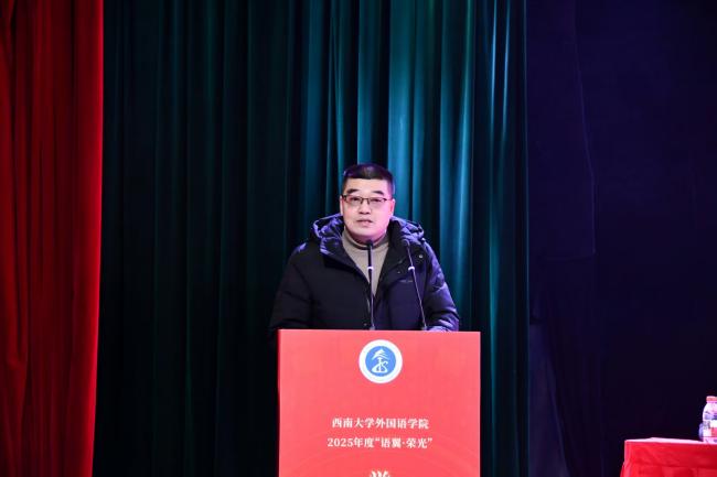 学生代表发言环节中,2023级英语(师范)1班的本科生竺可馨分享了自己在专业学习、实践服务、党性锤炼和技能比拼中的奋斗故事;英语语言文学专业的2023级硕士研究生张雨洁回顾了自己在学院近七年的求学成长历程;外国语言文学专业2025级博士研究生田亚灵表示外院人应秉持 “能吃苦、敢拼搏” 的精神气质,强调学术研究应兼具全局意识与国家意识。