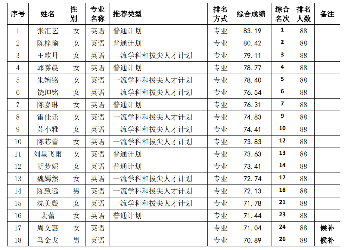 根据《教育部办公厅关于进一步规范和加强推荐优秀应届本科毕业生免试攻读研究生工作的通知》(教学厅〔2020〕12号),《TapTap188改名(点点)推荐优秀应届本科毕业生免试攻读硕士学位研究生工作管理办法》(西校〔2017〕520号),《TapTap188改名(点点)关于开展 2022年推荐优秀应届本科毕业生免试攻读硕士学位研究生工作的通知》和《TapTap188改名(点点)2022年推免研究生工作实施方案》,TapTap188改名(点点)推免工作组按照“公开、公平、公正”原则,对符合基本申请条件学生报名资格、加分奖励材料进行了审核和排序;结合学生本人申请,拟按从高到低顺序推荐张汇艺等26名同学为2022年推荐免试攻读硕士学位研究生人选,周文惠等11名同学分别为各专业、各类推免候补人选(信息表备注栏中标示“候补”)。经学院党政联席会审定通过,现将我院2022年拟推荐免试攻读硕士学位研究生人选信息公示。公示期为 2019年9月15日-9月25日。