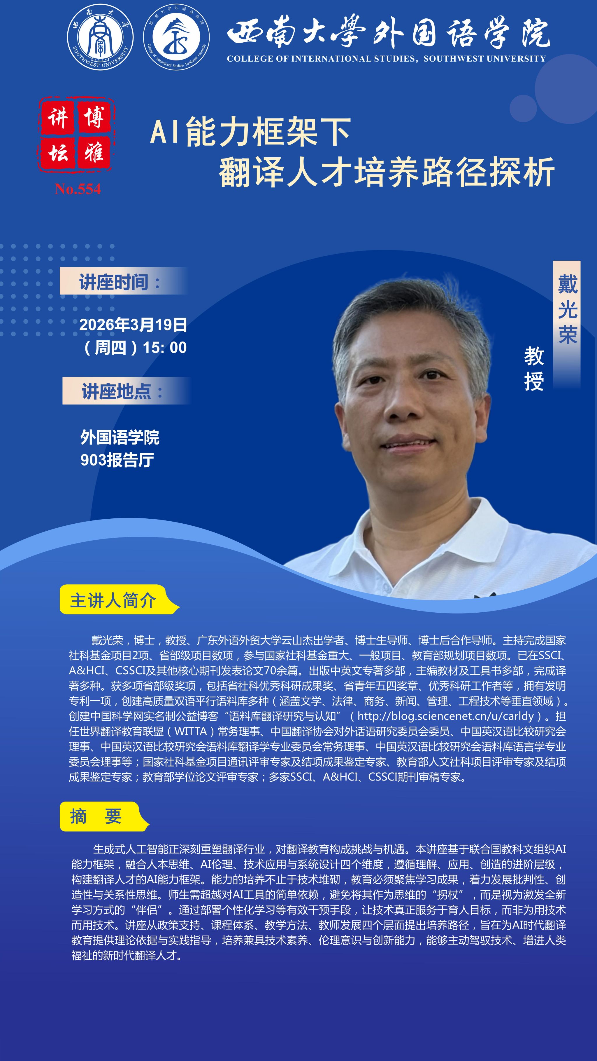 讲座题目:AI能力框架下翻译人才培养路径探析