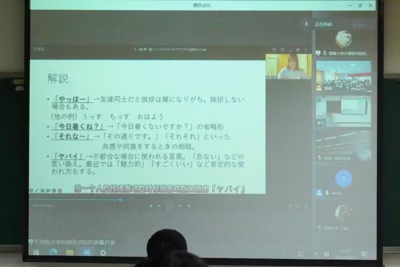 其次是作品展示环节,来自明星大学的学生们以生动活泼的语言介绍了“日本的无障碍设施”,“日本的食品模型技术”等内容;我院学生也带来了主题丰富的作品,他们采用短视频加日文配音的方式展示了各自家乡的民俗风情和风味小吃,向日方学生展示了中国之美景和美食。中日大学生短视频作品展示环节极大地促进了两国学生的交流和理解,进一步夯实了中日大学生间的友谊。