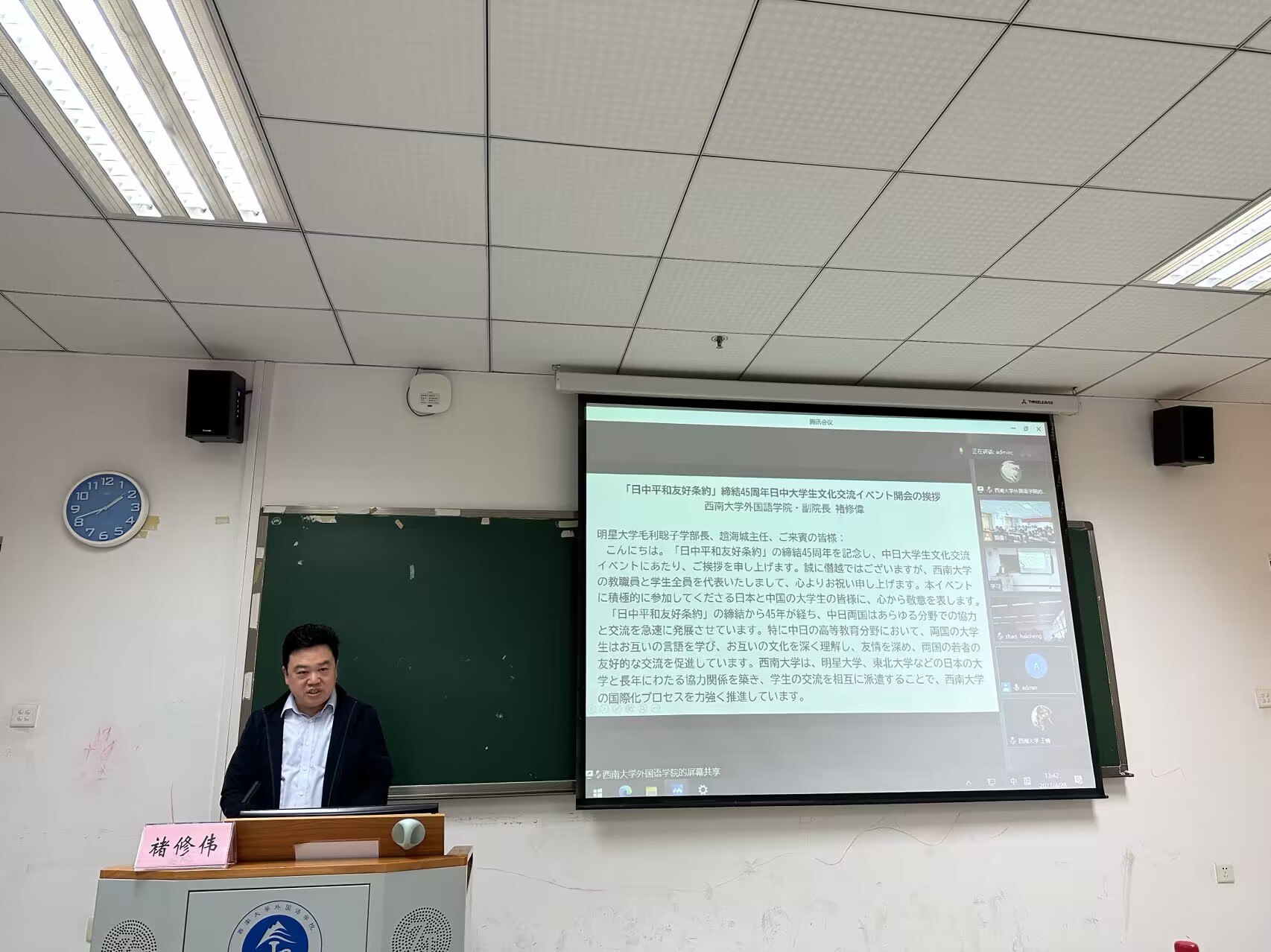 本次活动由三部分组成。首先是褚修伟副院长发表开幕词致辞,在致辞中褚院长对参加本次活动的中日两国大学生表达了衷心的祝愿,并希望此次活动能激励两国大学生为中日友好关系的发展贡献力量。明星大学人文学部毛利聪子学部长代表日方致辞,对本次活动的举办表示祝贺,对中日两国大学生的交流寄予很大希望,相信中日两国的友好关系将进一步发展和增强。