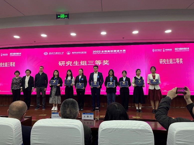 为深入学习贯彻习近平新时代中国特色社会主义思想,持续推进我国与欧亚地区国家及上海合作组织框架下的教育交流合作,着力培养“讲好中国故事”的俄语人才,由教育部国际合作与交流司主办、上海外国语大学承办的2022全国高校俄语大赛复决赛于2023年5月6日至7日在上海外国语大学松江校区成功举办。我院俄语系2022级研究生唐巧玲同学荣获研究生组三等奖。