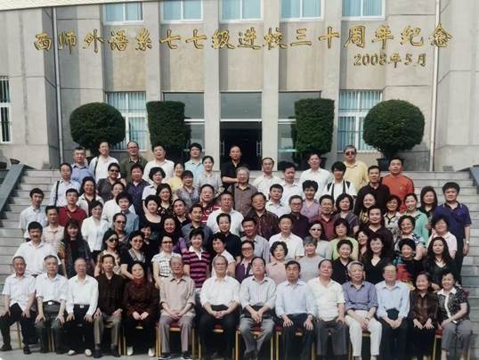 当年的5月,我应邀参加西师77级进校三十周年纪念活动,看见了江老师那熟悉的身影。从老同学口中得知,江老师已经退休了,但他仍是那么红光满面,精神焕发,不过已经明显谢顶了。人声嘈杂,川流不息,我见了老师来不及寒暄几句,就匆匆步入会场,会后留下了下面这张珍贵的大合影。